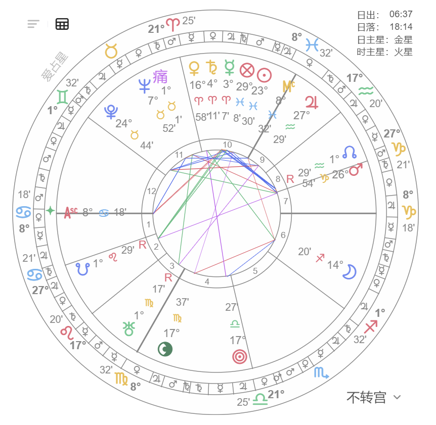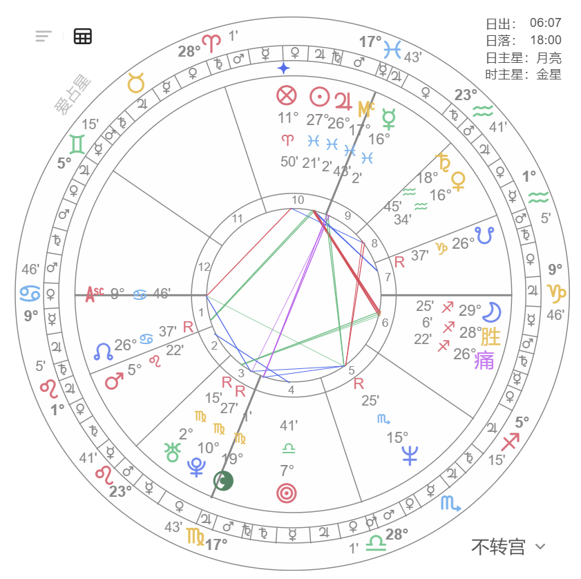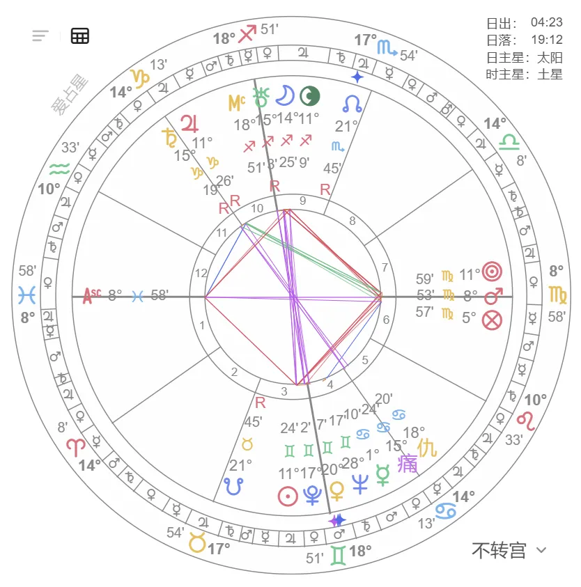 痛苦点主星(定位星)所落的宫位,同样能揭示痛苦与危机的来源或领域。例如,若痛苦点在4宫,主星金星落在12宫,则家庭痛苦可能与隐秘敌人、精神困扰有关。
