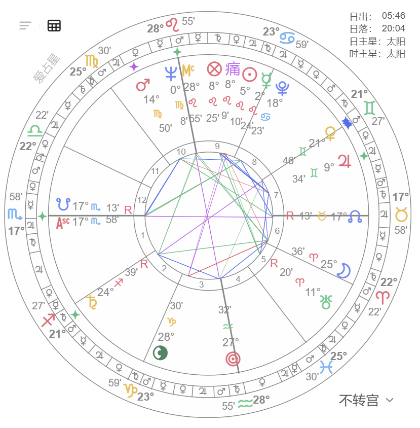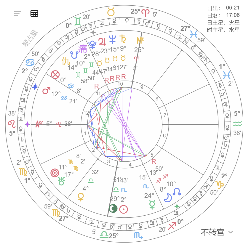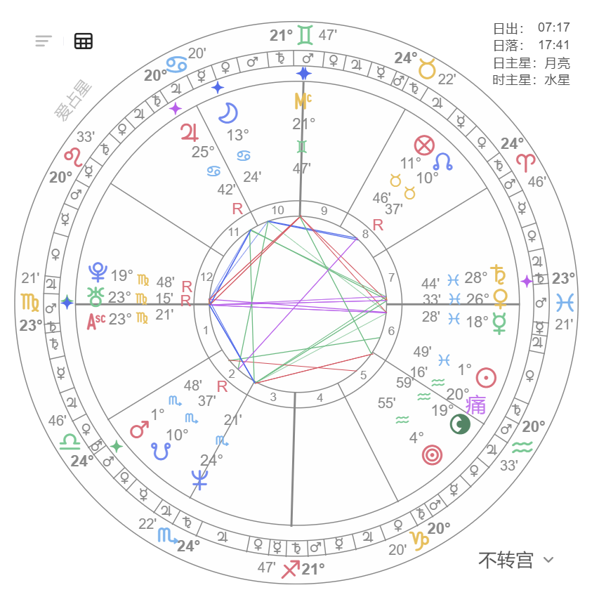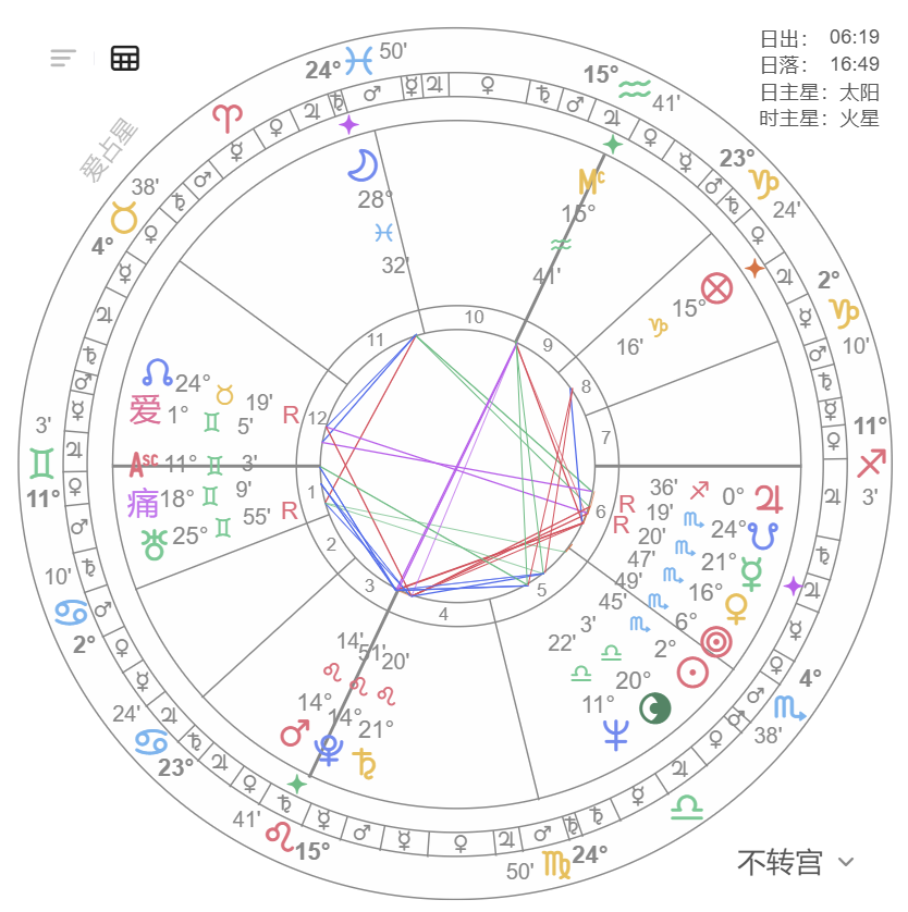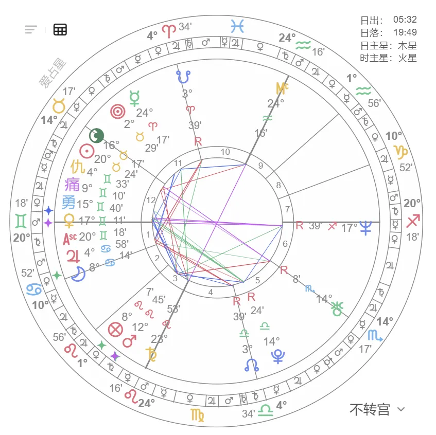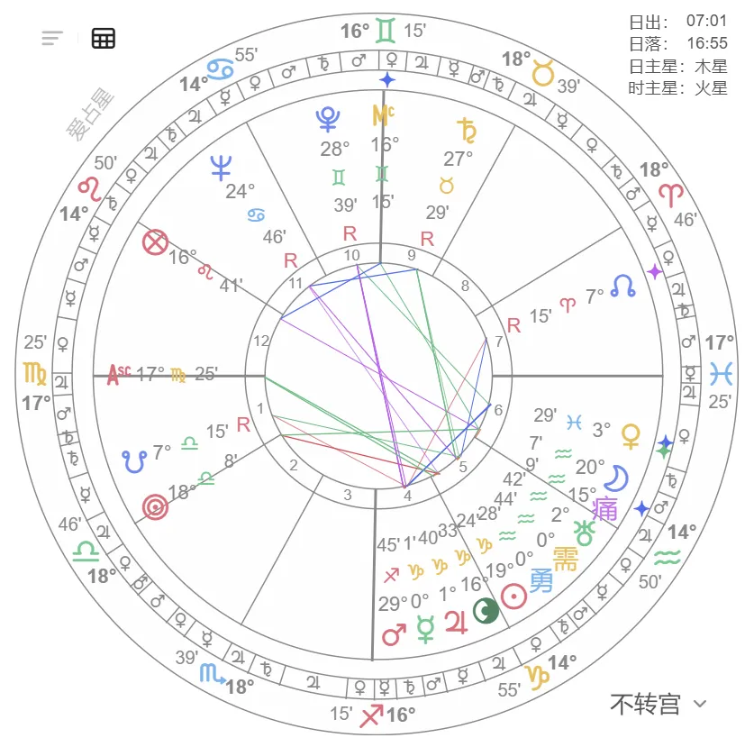 - 太阳/月亮与火星/土星成六分相(7° 内),代表危机面前格外脆弱;六分相越多,危机概率越高。