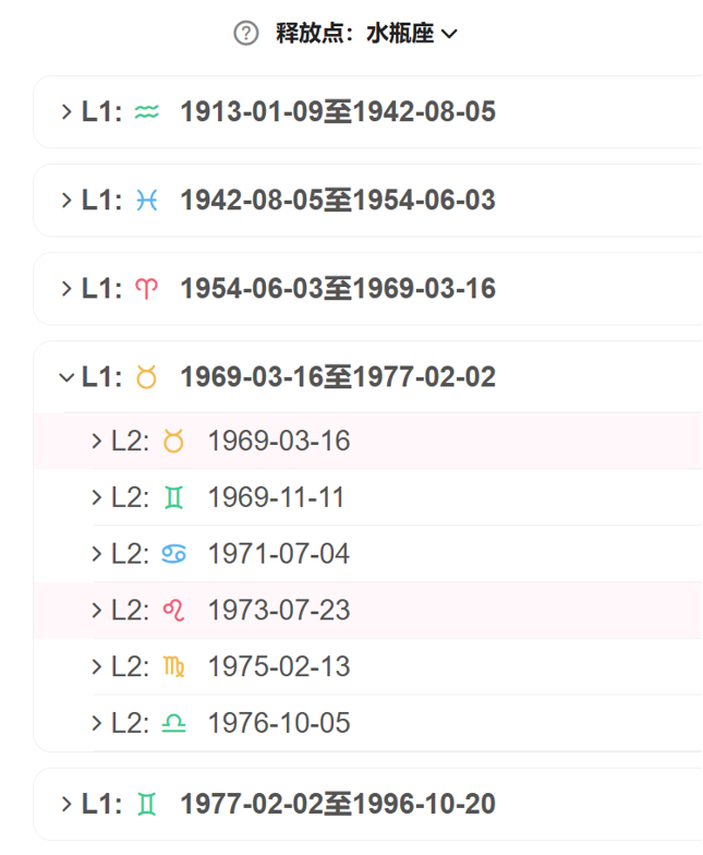 我们以水瓶座进行黄道释放,可以看出1969年3月至1977年2月的8年金牛座周期为痛苦点的活跃期。